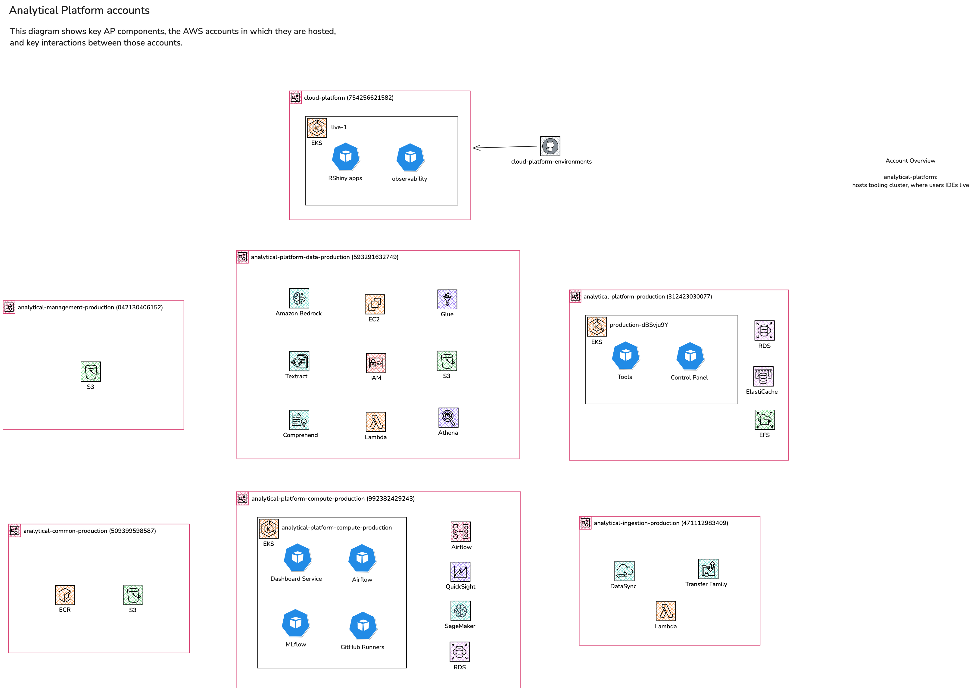 - AWS accounts diagram. Documents key AP components, the AWS accounts in which they are hosted, and key interactions between those and other key MOJ accounts and services. Please refer to this in conjuction with the AP data and compute accounts diagram.